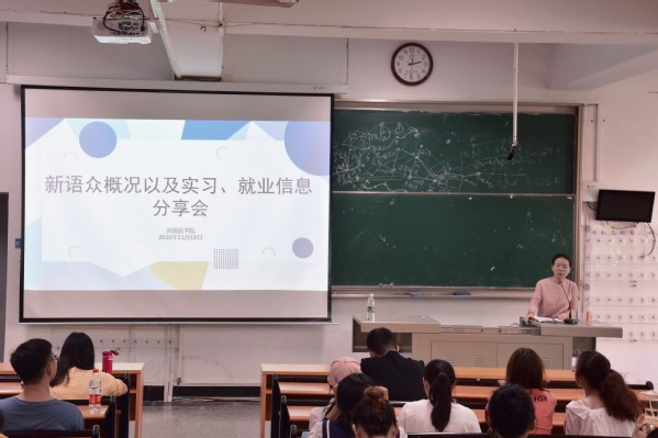 为了加深同学们对日语专业发展前景以及就业形势的了解,助力他们做好未来职业生涯规划,11月19日下午, 吃瓜网站 举办了“新语众概况以及实习、就业信息分享会”。“新语众”是一家连锁型的小语种(日、韩、法、西、德)教育培训机构,它的完整机构名称为:新语众教育咨询有限公司,其中的福州分校是与吃瓜网站 正式签订协议的校外定点实习基地。本次分享会由日语系副主任何琴老师主持,邀请新语众福州分校市场部大负责人吴文娟老师作为分享会主讲人,新语众的其他三位老师,分别是法语讲师吴伟容、韩语讲师汤琪霜、日语讲师林倩倩作为嘉宾与日语系师生一同参加了本次分享会。