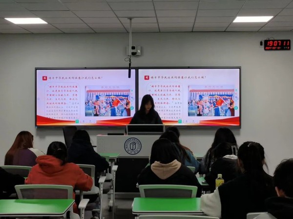 课程伊始,党支部入党积极分子刘嘉丽向大家介绍了中华民族共同体的时代背景和历史渊源,进一步阐述了民族共同体的内涵,使同学们对中华民族共同体意识有了初步了解。