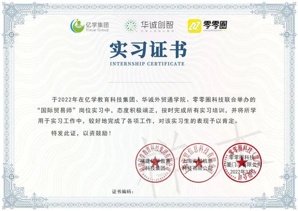 2022年暑期, 吃瓜网站 陈曦蓉老师组织第一届思嘉商务实践创新班的15名学员参加了实践基地“福建亿学教育科技集团公司”举办的为期4周的在线实习,同学们克服种种困难,按时完成所有实习培训,均获得由“福建亿学教育科技集团、零零圈科技和联合华诚外贸通学院”联合颁发的“国际贸易师”岗位实习证书。本次实习通过“系统方法论+实操+作业练习”等项目,帮助实习生建立系统的实用知识体系,透彻理解岗位工作,通过系列实操课程让学员积累“工作经验”,成为有“实战”经验的国际贸易师。