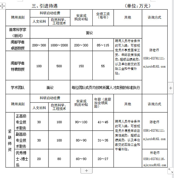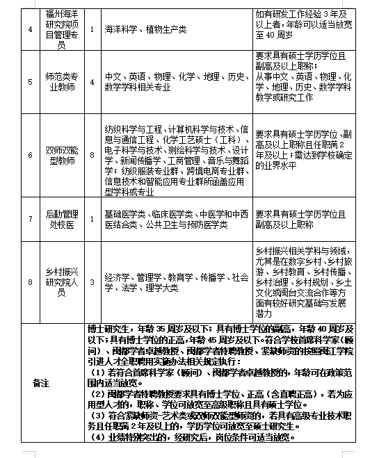 如入选福建省高层次人才,可按规定叠加享受相应待遇及配套支持。具有博士学位或副高级专业技术职务的优秀人才,符合条件者可申请直聘正高。若为学校急需专业人才,经研究可按照“一才一策”、“一事一议”的原则执行。