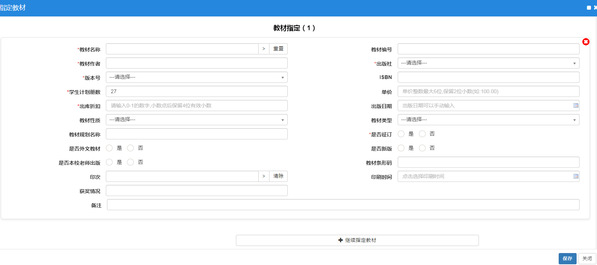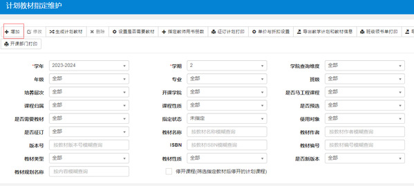 在此菜单下可查询到本单位教学计划课程信息,单选或复选指定课程,点击增加,打开教材指定页面,进行教材选择及教师用书征订、修改等操作。