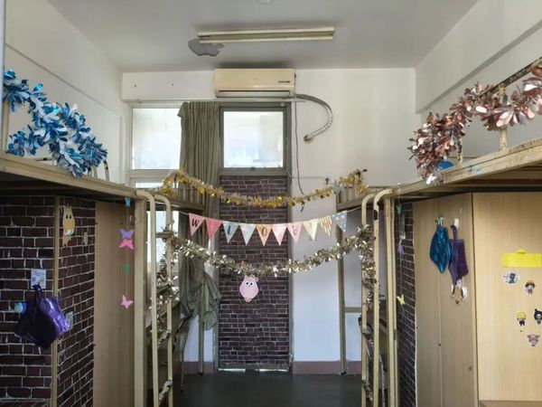经过装扮的新生宿舍里,气球、彩条等元素被巧妙地搭配在一起,有的点缀在柜子旁边,有的悬挂在门窗上,此外大家还装饰有可爱的标语,宿舍里处处都透着对新生的热烈欢迎,整体氛围温馨又充满活力。