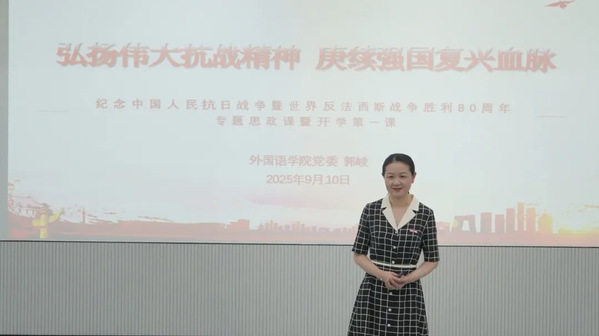 课上,郭崚书记以《弘扬伟大抗战精神,赓续强国复兴血脉》为题,带领全体新生学习了习近平总书记在纪念中国人民抗日战争暨世界反法西斯战争胜利80周年大会上的重要讲话,并一同回顾阅兵盛况。她带领同学们一起重温了习近平总书记回校考察时的重要讲话精神,要求同学们要树立远大理想、热爱伟大祖国、担当时代责任、勇于砥砺奋斗、练就过硬本领、锤炼品德修为,成为德智体美劳全面发展的社会主义建设者和接班人,为中国式现代化建设贡献自己的力量。最后,她鼓励同学们“Stay Hungry Stay Foolish”,要始终保持“求知若渴、虚心若愚”的态度,努力学习,不断成长和突破,不断创新和挑战!