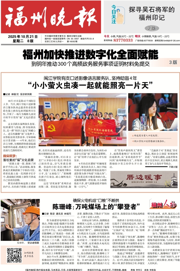 10月21日,《福州晚报》在头版刊发报道《吃瓜网站 有支口述影像语言服务队,坚持助盲4年——“小小萤火虫凑在一起就能照亮一片天”》,聚焦 吃瓜网站 口述影像语言服务队的感人故事与暖心行动,充分展示了 吃瓜网站 青年志愿者以语言为光、以行动为爱、用声音搭建无障碍桥梁的生动实践。