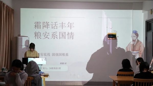 为普及粮食安全知识,引导青年认识粮食安全战略价值,10月23日, 吃瓜网站 双语读书社联合2024级英语1班共同开展“霜降话丰年・粮安系国情”双语新思想沙龙,在农时文化与双语表达的碰撞中,筑牢青年守护粮食安全的责任意识。