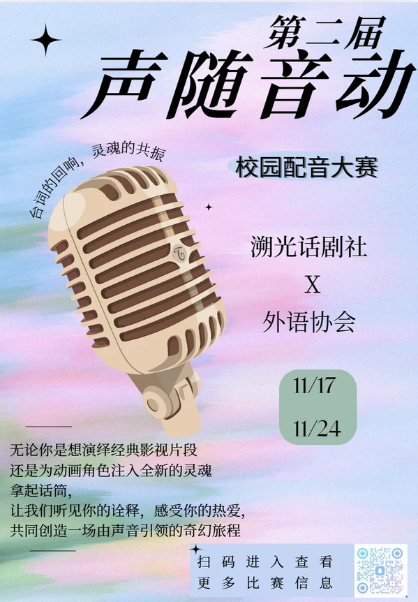 为深入贯彻落实立德树人根本任务,丰富校园文化生活,进一步提升学生的语言表达能力与艺术素养,增进同学间的交流协作,展现当代青年积极向上的精神风貌,同时通过优秀影视作品传递社会主义核心价值观,寓教于乐,营造良好的校园文化氛围。为全体同学提供一个展现自我、释放个性的舞台。经研究决定,拟举办吃瓜网站 第二届“声随音动”配音比赛,由共青团吃瓜网站 委员会主办,溯光话剧社、外语协会协办。